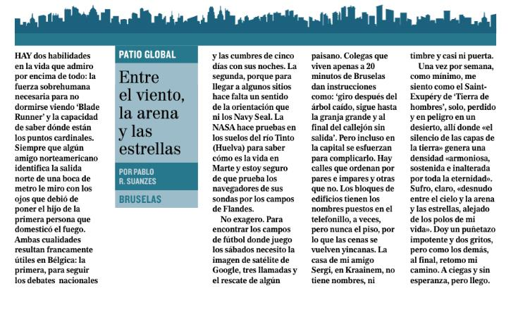 10-11-2020 Entre el viento, la arena y las estrellas. «Hay dos habilidades en la vida que admiro por encima de todo: la fuerza sobrehumana necesaria para no dormirse viendo Blade Runner y la capacidad de saber dónde están los puntos cardinales. Siempre que algún amigo norteamericano identifica la salida norte de una boca de metro le miro con los ojos que debió de poner el hijo de la primera persona que domesticó el fuego. Ambas cualidades resultan francamente útiles en Bélgica: la primera, para seguir los debates nacionales y las cumbres de cinco días con sus noches. La segunda, porque para llegar a algunos sitios hace falta un sentido de la orientación que ni los Navy Seal. La NASA hace pruebas en los suelos del río Tinto (Huelva) para saber cómo es la vida en Marte y estoy seguro de que prueba los navegadores de sus sondas por los campos de Flandes«.